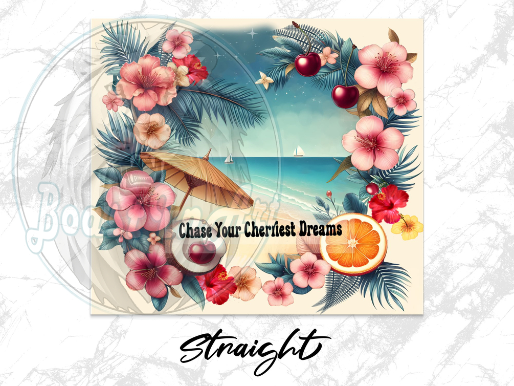 Bring the joy of tropical vibes to your tumbler collection with this stunning sublimation wrap design 🌞. Featuring vibrant hibiscus flowers 🌺, juicy cherries 🍒, and a serene beach scene complete with a cozy umbrella and a sailboat on the horizon ⛵, this design is perfect for creating cheerful and uplifting drinkware. The playful phrase "Chase Your Cherriest Dreams" adds a motivational touch 🍊.